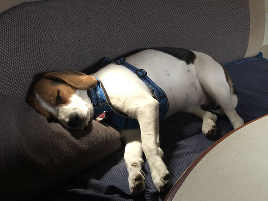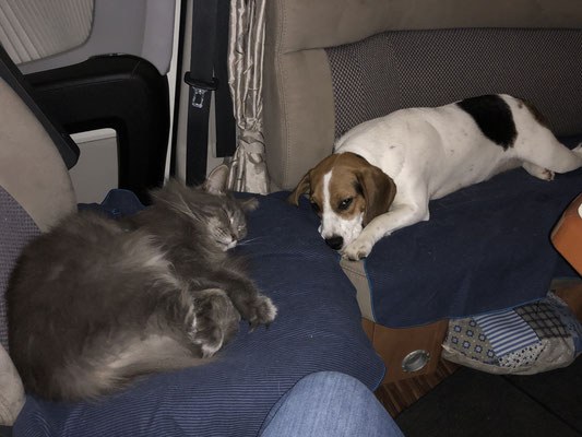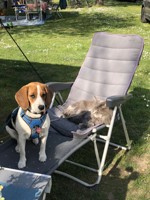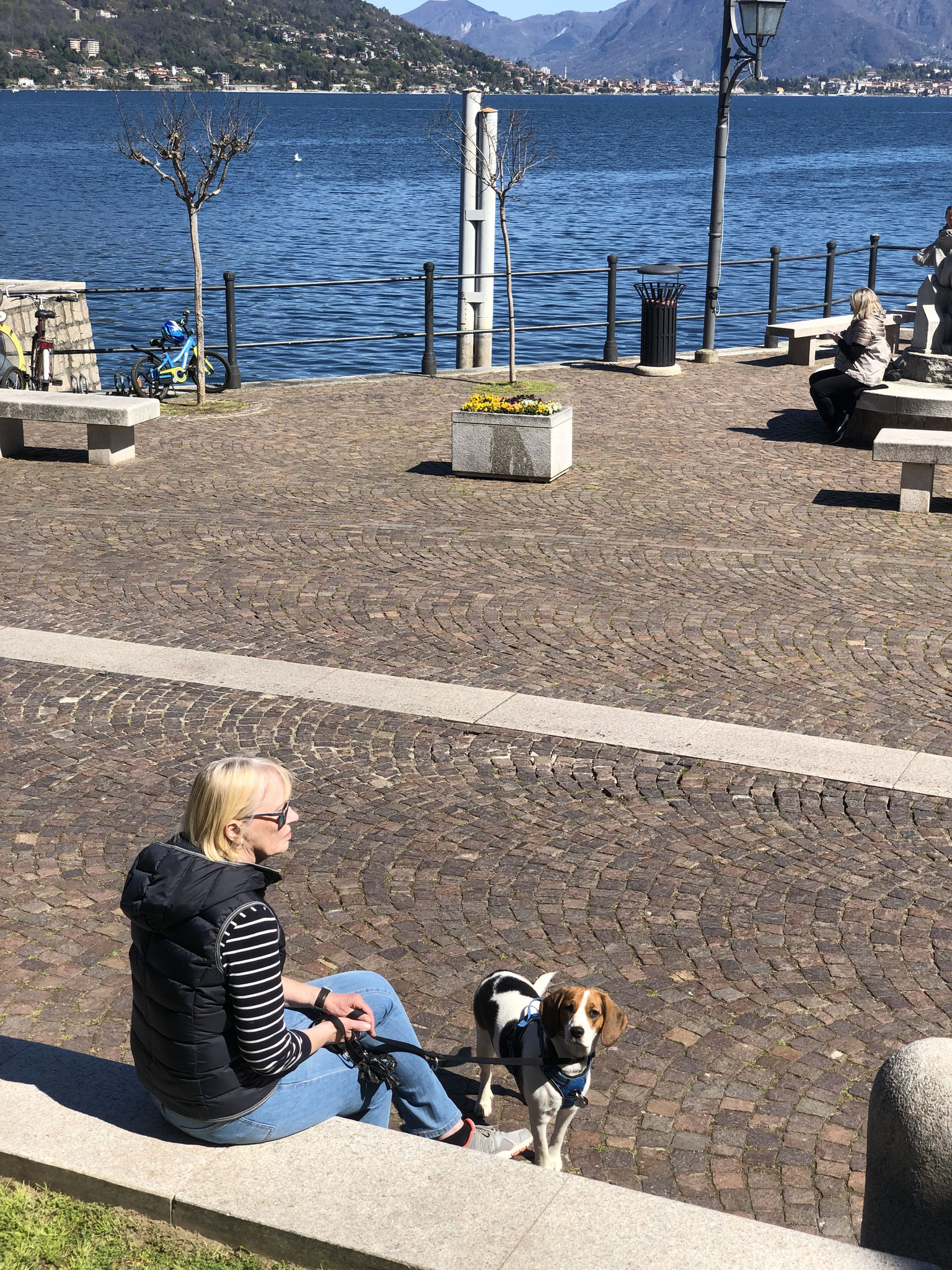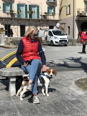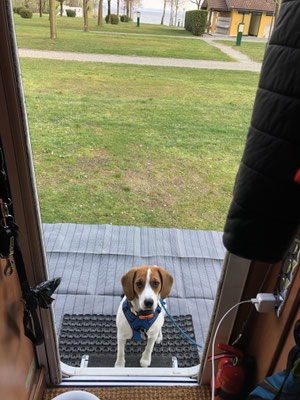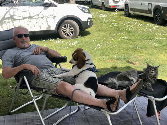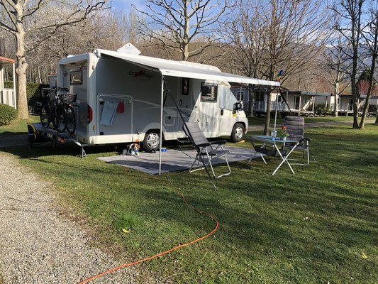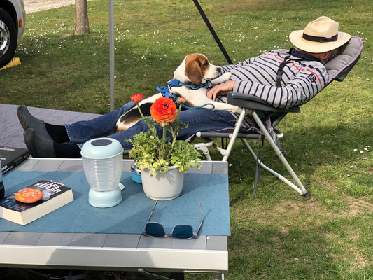 Der Campingplatz liegt südlich unweit der Mündung des Flusses Toce in den Lago Maggiore. Irgendwie hatte wir aber bei unseren Spaziergängen immer das Gefühl, dass auch Wasser rückwärts in den Fluß fließt. Wir haben uns nicht getäuscht (siehe Link oben !). Jetzt zwei Wochen vor Ostern war der Platz noch sehr leer, und so hatten wir trotz des Platzes in der letzten Reihe (noch) freie Sicht auf den See. Lesen und relaxen war angesagt, jeder suchte sich einen gemütliches Plätzchen, wobei Paula sich mehrere vereinnahmte. Die Siesta auf "Papa's Bauch", aber auch im Wohnmobil oder im Hundeanhänger. Leo hingegen bevorzugte die Ablage unter dem Tisch, welche er als Hängematte umfunktionierte, oder einen der Stühle.